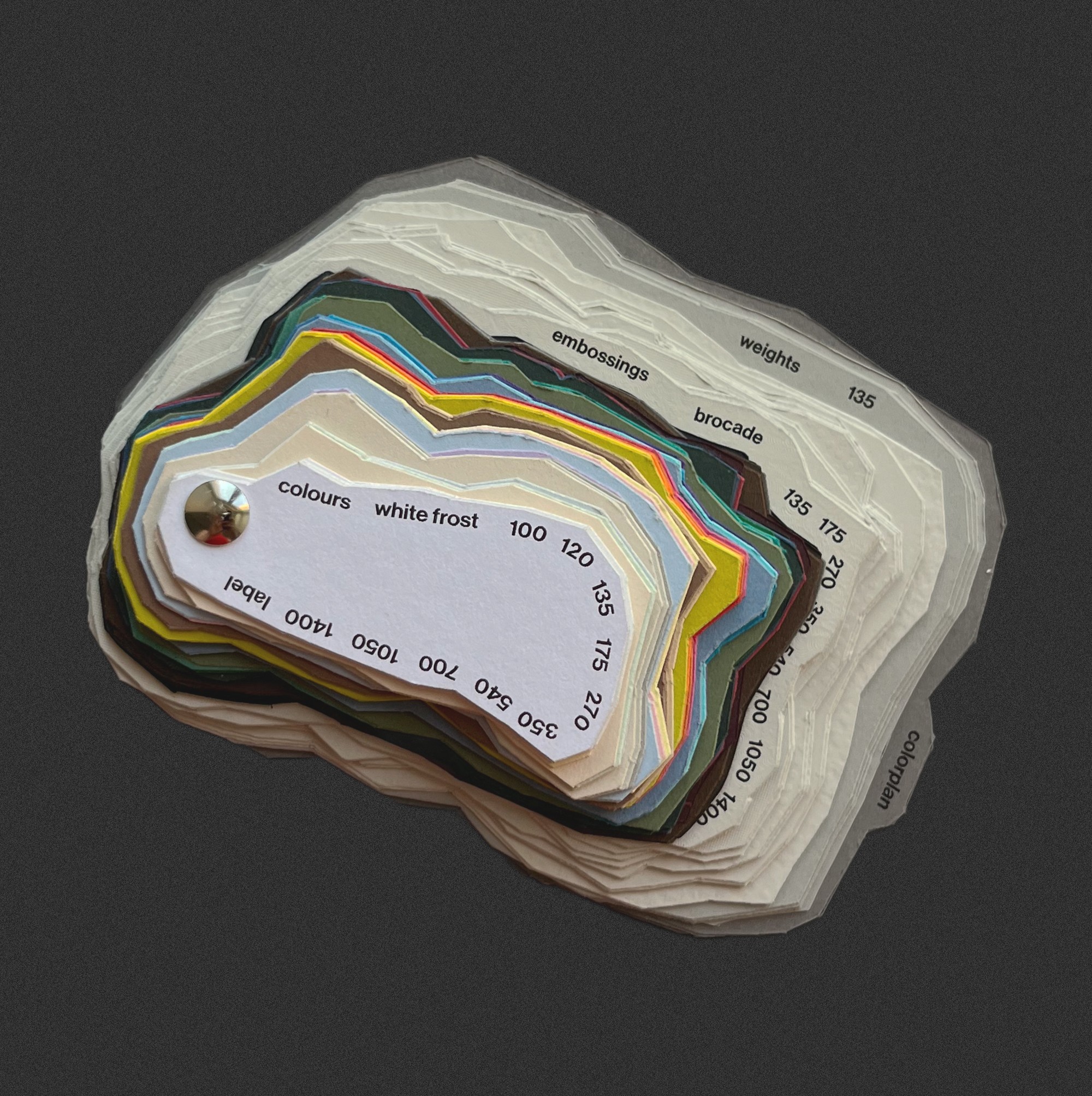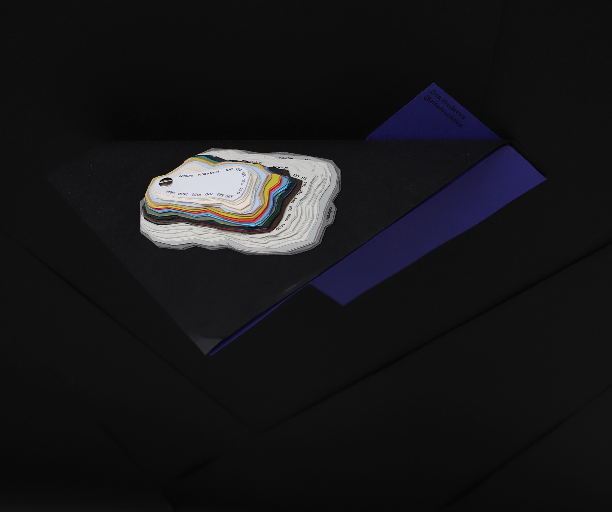 The physical swatch book refers to the very origin of the paper – to the tree and its geographical location. The inspiration came from contour lines, the shape of which changes according to the altitude at which the tree grows. The numerical data on the height here replaces the paper weight values and its name.